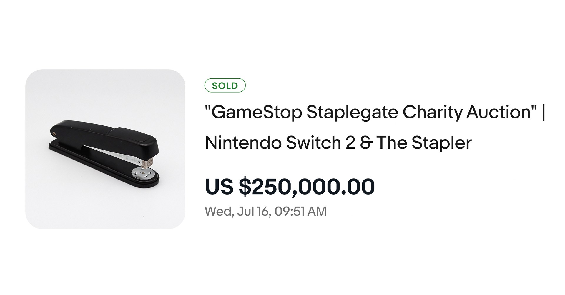 Para mudar a percepção, a Gamestop anunciou um leilão de caridade em 9 de julho. Seria leiloar o grampeador “grampeleco” que o funcionário usou “em um momento de emoção noturna de lançamento e entusiasmo mal julgado”, de acordo com o Listagem do eBay. Para o leilão, ao lado, foi o primeiro interruptor 2 grampeado, sua caixa e o grampo que o perfurou. Todos os rendimentos da oferta vencedora serão destinados aos hospitais da Children’s Miracle Network.