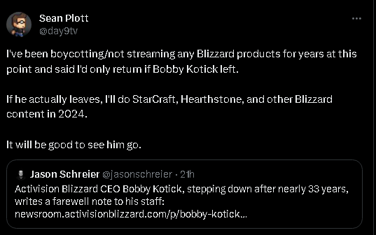 Bobby diz em sua nota “Eu serei eternamente grato às pessoas que contribuíram incansavelmente para construir esta empresa, e estou confiante de que vocês continuarão inspirando alegria e unindo as pessoas por meio do poder do jogo.”, ele também elogia Phill Spencer, relembrando quando o processo de compra da empresa havia se iniciado