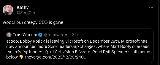 No dia 20 de Dezembro de 2023, a Microsoft revelou que o antigo CEO da Actvision, Bobby Kotick irá deixar seu cargo no dia 29 de Dezembro de 2023, além disso foi deixado uma nota do antigo presidente no site da empresa, onde ele elogia os funcionários e traça uma retrospectiva do que foi desenvolvido anteriormente.