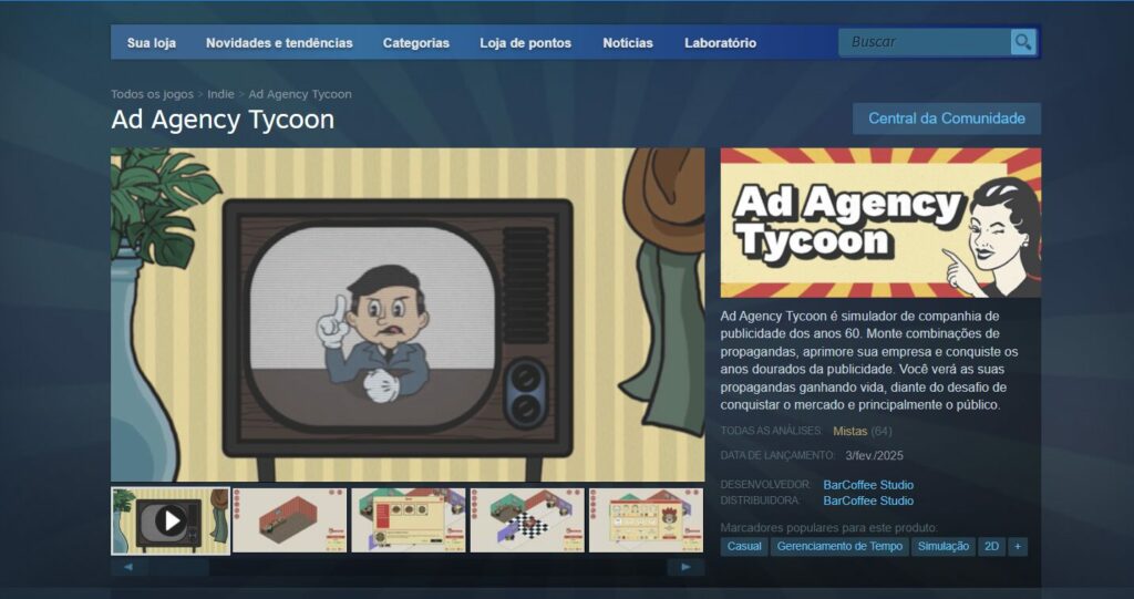 Ad Agency Tycoon é um dos simuladores mais criativos já feitos por um estúdio brasileiro, especialmente para quem é fã de estratégia, design e cultura pop dos anos 60. Se você curte Mad Men ou sempre quis saber como seria liderar uma agência de publicidade na era clássica, este game é para você.