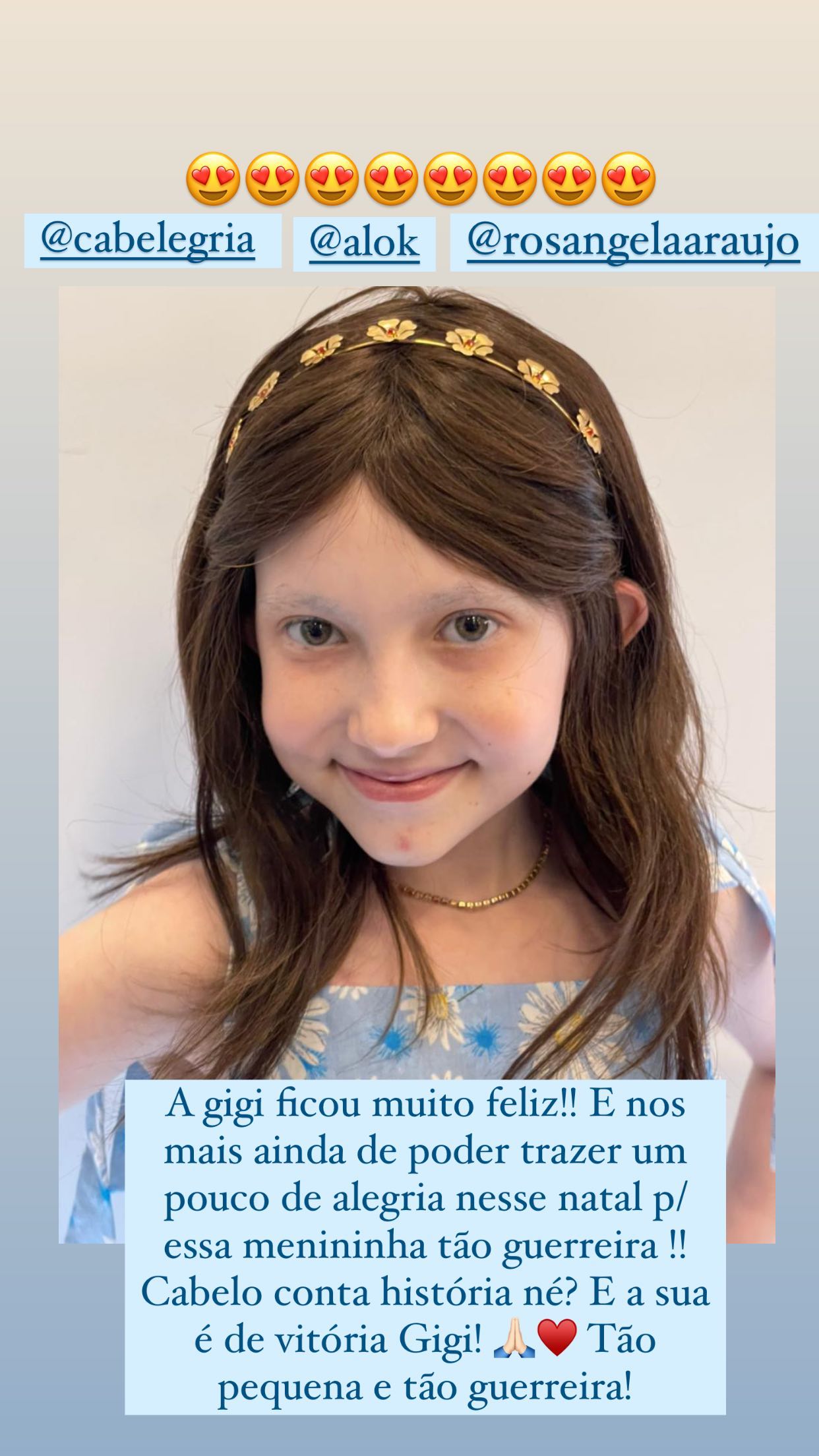 “A Gigi ficou muito feliz! E nós mais ainda de poder trazer um pouco de alegria nesse Natal para essa menininha tão guerreira! Cabelo conta história, né? E a sua é de vitória, Gigi. Tão pequena e tão guerreira“, disse Romana.