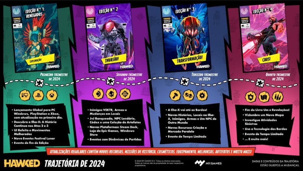 Nesta semana, a distribuidora e desenvolvedora MY.GAMES anunciou que o game HAWKED chegará para PS4, PS5 e Xbox Series X|S após seu período de acesso antecipado no PC. Os trabalhos para o jogo de tiro e extração em terceira pessoa começam gratuitamente nesta quinta (15) pelas respectivas plataformas de acesso para cada console.