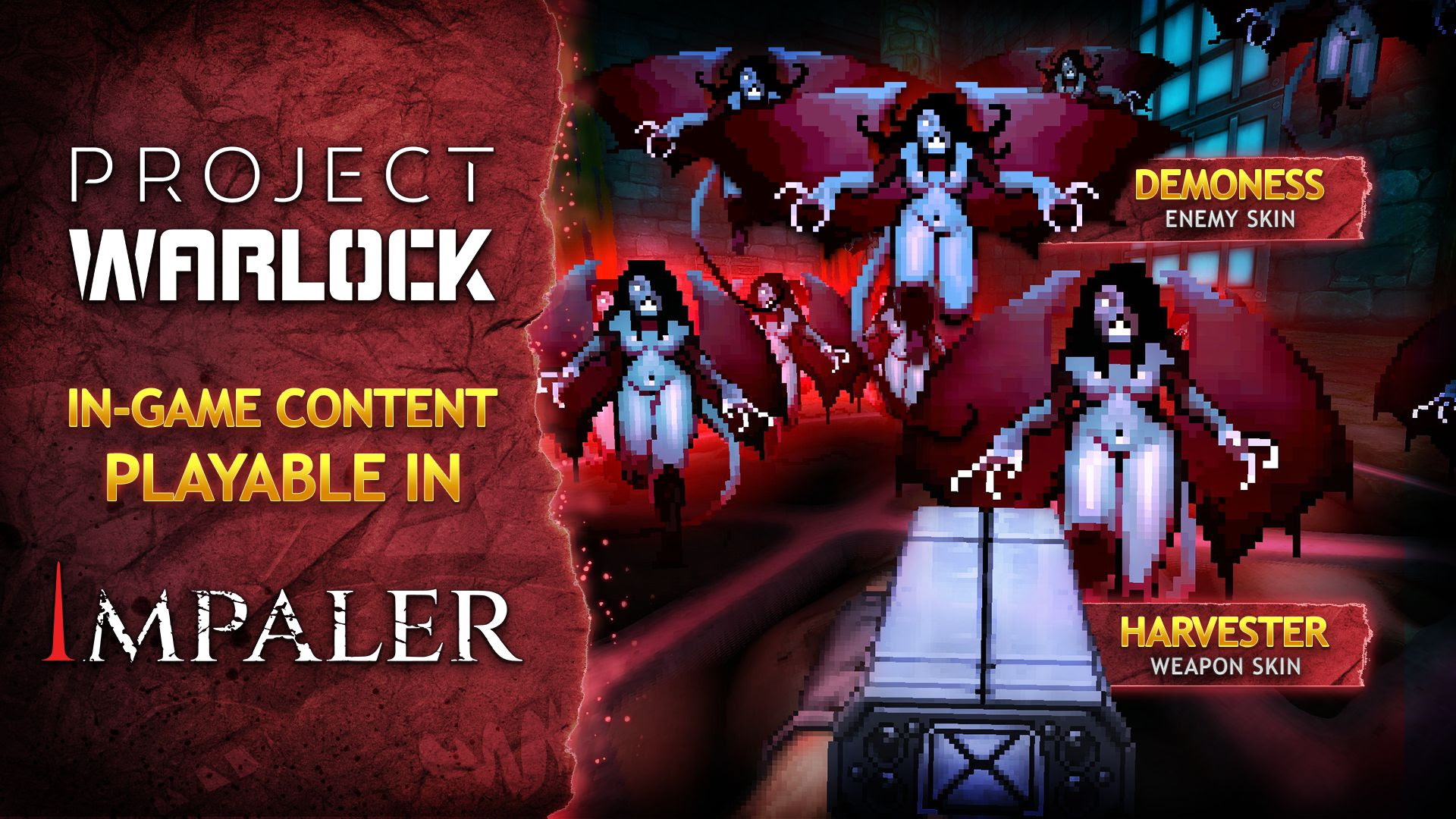 Beloved (and feared) by players Demoness is invading Impaler’s cathedral and the powerful Harvester shotgun is there to stop her from sucking out players’ life! Upon its release on December 6, Impaler will include in-game enemy and weapon skins from Project Warlock. This unique content will be playable for a limited time, until January 5, 2023.
