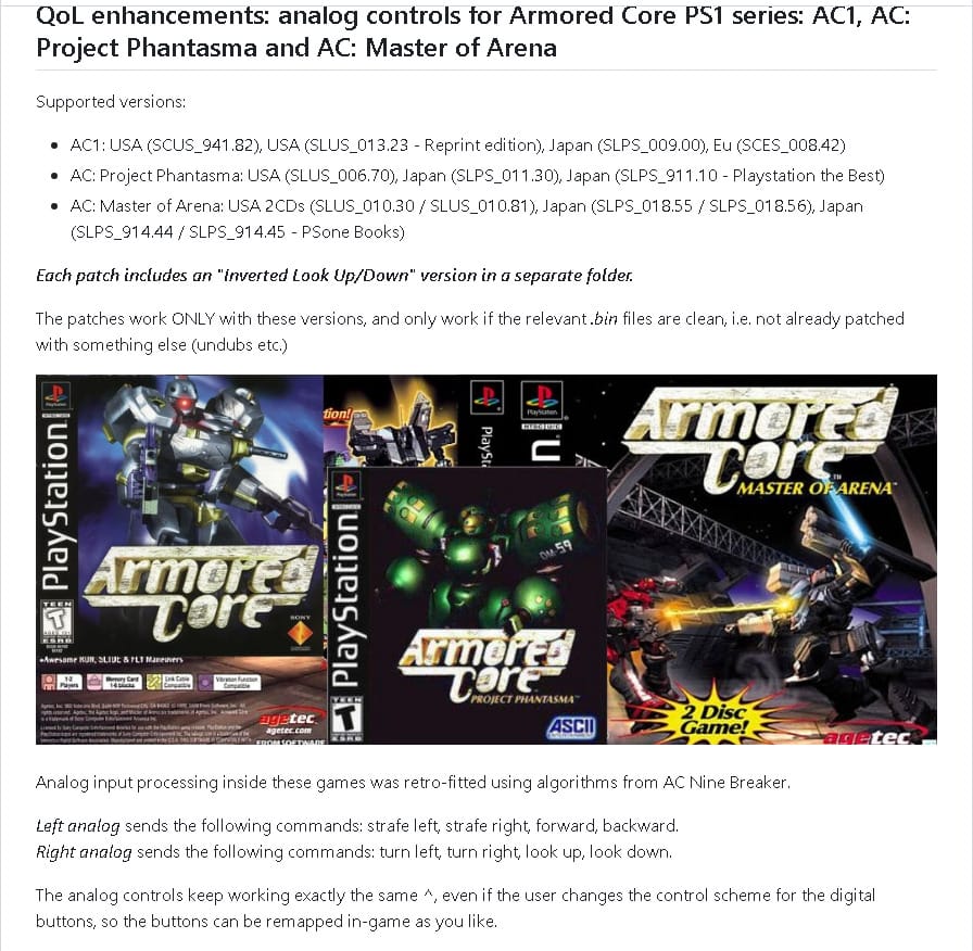 Anteriormente os jogos do PlayStation 2 da série Armored Core receberam modificações a qual adicionavam a função de se jogar com o analógico para os títulos que o D-Pad era usado para controlar o mecha e o L2 e R2 para olhar pra cima e para baixo. Porém agora os três primeiros jogos da série também receberam essa modificação.