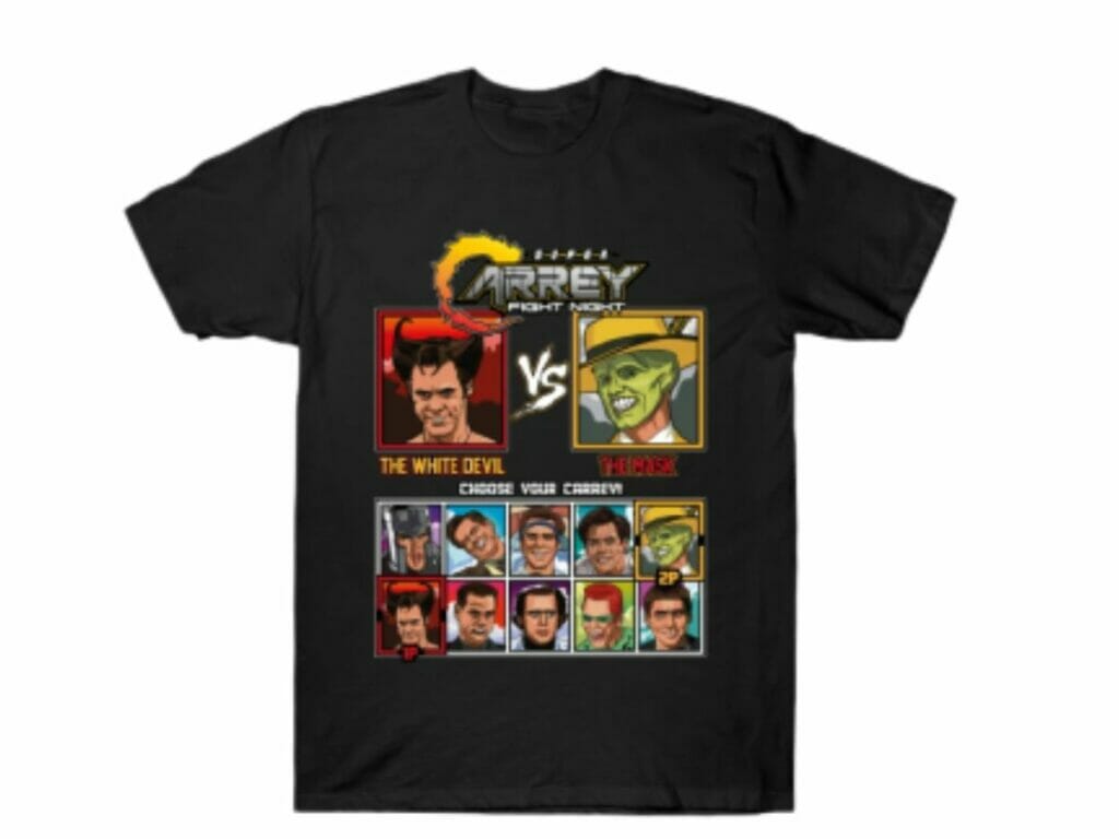 A loja TeepPublic, especialista em designs para diversos tipos de produtos, chamou a atenção com uma de suas camisetas do catálogo, que imagina os personagens já feitos por Jim Carrey em um jogo de luta. Na estampa, é possível ler ainda ‘Super Carrey Fight Night’.