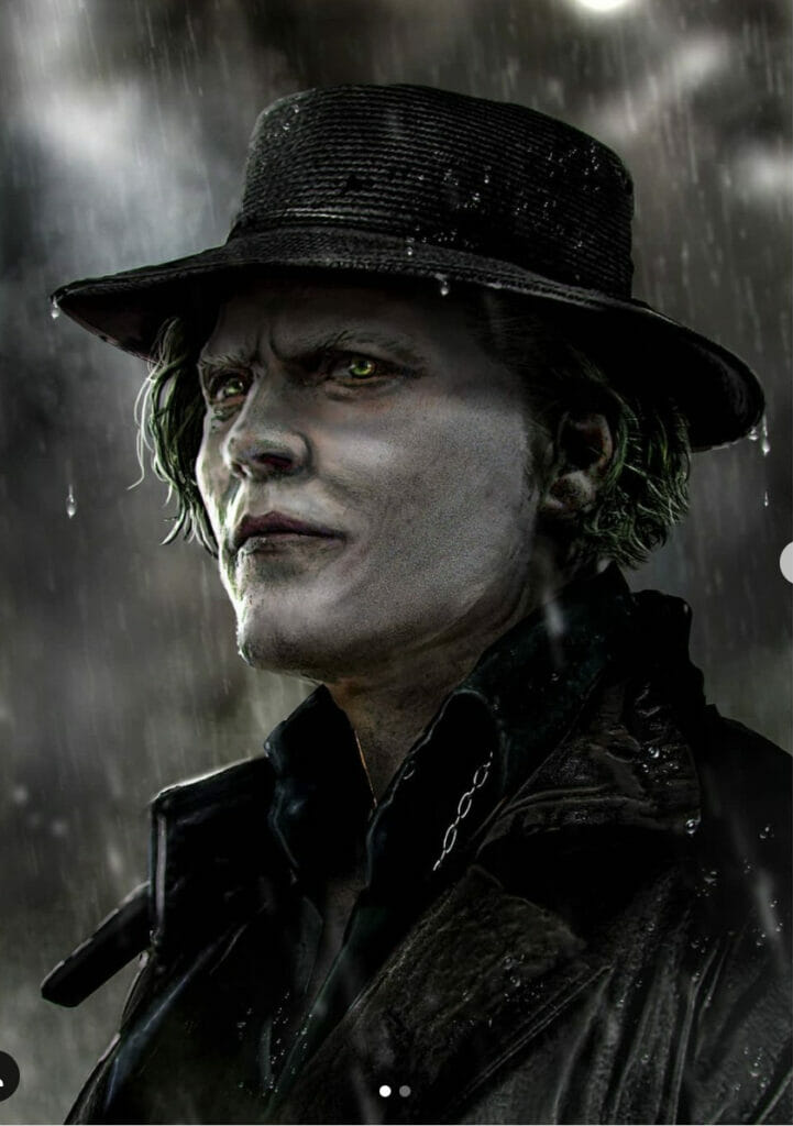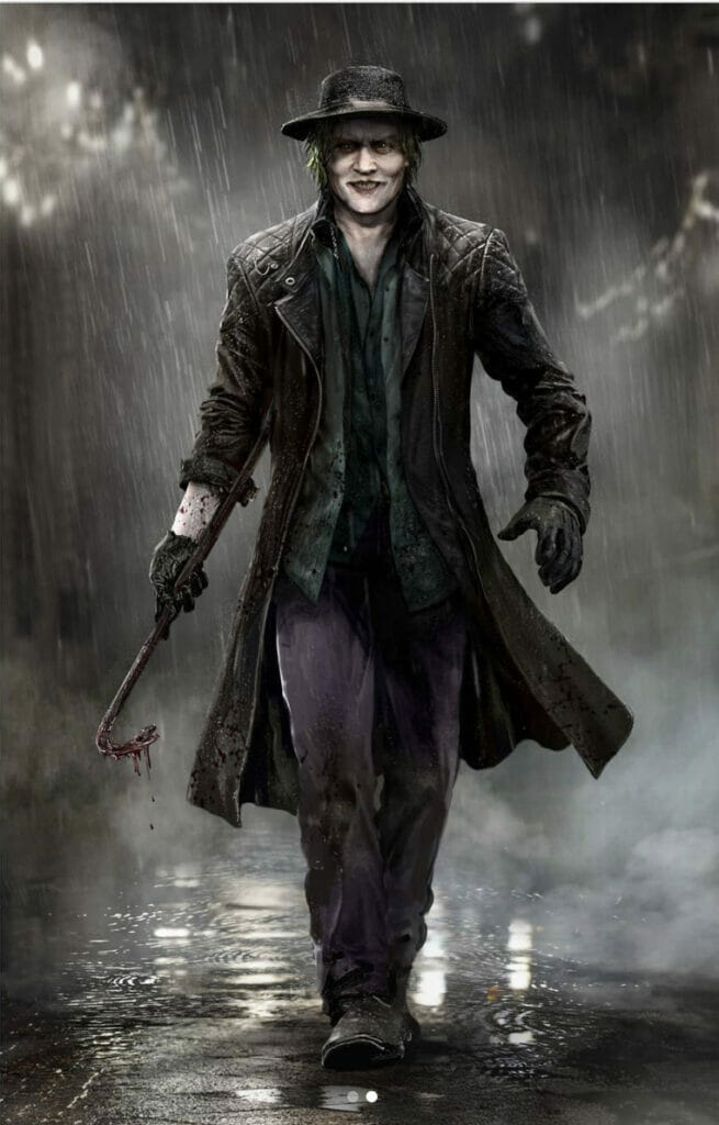 A arte de Johnny Depp como o Coringa o retrata com o icônico cabelo verde do vilão, embora ele não tenha um sorriso vermelho exagerado como outras versões populares do vilão da DC Comics. Uma segunda imagem mostra Johnny Depp vestindo uma camisa verde e calça roxa enquanto empunha um pé de cabra ensanguentado.