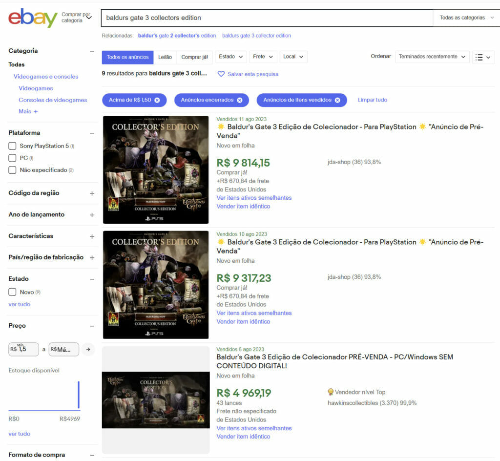 Cópias da Edição de Colecionador esgotada de Baldur’s Gate 3 estão sendo vendidas no revendedor online eBay por até US$ 1.975 (R$ 9.838,66 na cotação atual) até o momento em que este artigo foi escrito. Isso é um pouco mais de sete vezes mais caro do que o preço pedido original de US$ 270 da desenvolvedora. O valor do jogo normal no Brasil é de R$ 199,99 no Steam.
