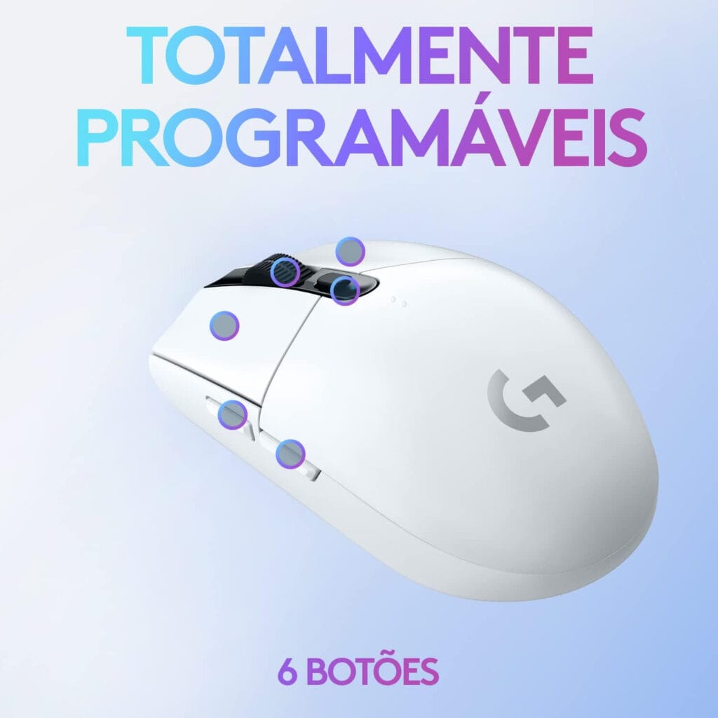 Para finalizar com estilo, esse Logitech é para você que quer investir um pouco mais e melhorar seu setup por completo. O mouse gamer sem fio G305 LIGHTSPEED possuí 6 botões programáveis, até 12.000 DPI, sensor HERO que economiza até 10x mais energia, tecnologia LIGHTSPEED que não possui nenhum delay responsivo, com sua taxa de resposta de 1ms ideal para competitivos, pilha ultralonga, com incríveis 250 horas sem interrupções ou pensar em recarregar, ultraleve e com 6 cores disponíveis. Esse mouse é simplesmente o um dos melhores do mercado atual.