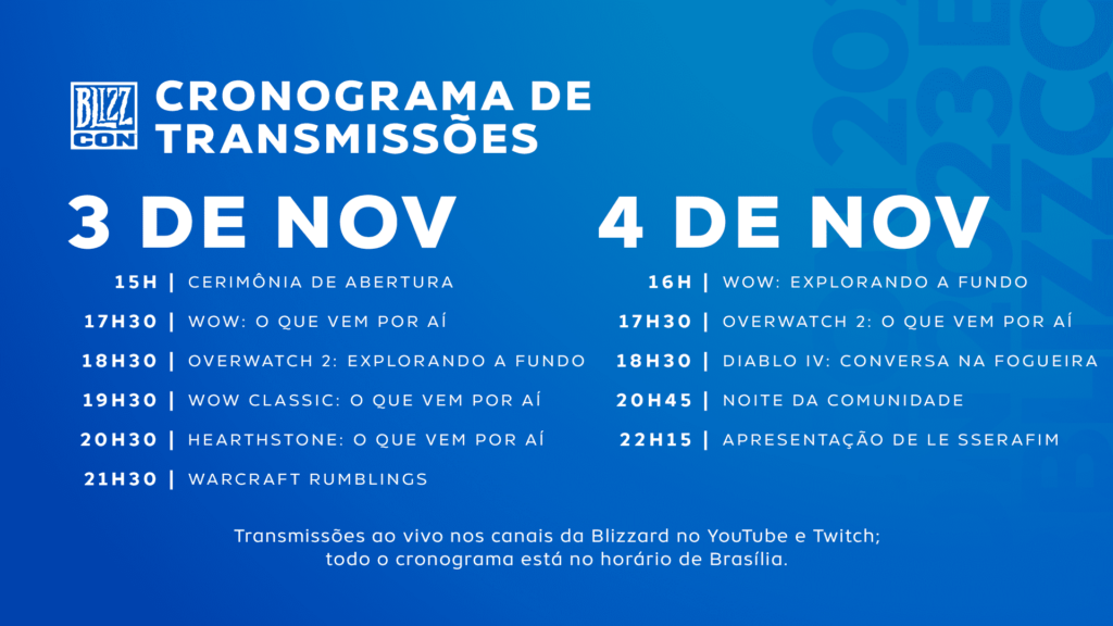 A BlizzCon 2023 está para começar. Para quem for acompanhar o evento de forma virtual, todos os conteúdos da BlizzCon Arena serão transmitidos ao vivo de graça tanto no Youtube ou na Twitch nos dias 3 e 4 de Novembro. A seguir, confira o cronograma da programação e dos painéis que será disponibilizada aos espectadores, no horário de Brasília: