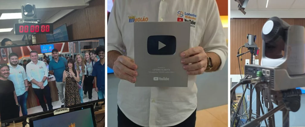 A estrutura de captação não deve nada à de pequenos estúdios de produtoras, e as câmeras PTZ oferecem mais ângulos e zooms do que a tarefa dali precisaria. Junto com isso, a iluminação profissional jogava seus fótons num troféu que muito streamer vai morrer sem conseguir: A placa de 100 mil escritos num canal do Youtube.