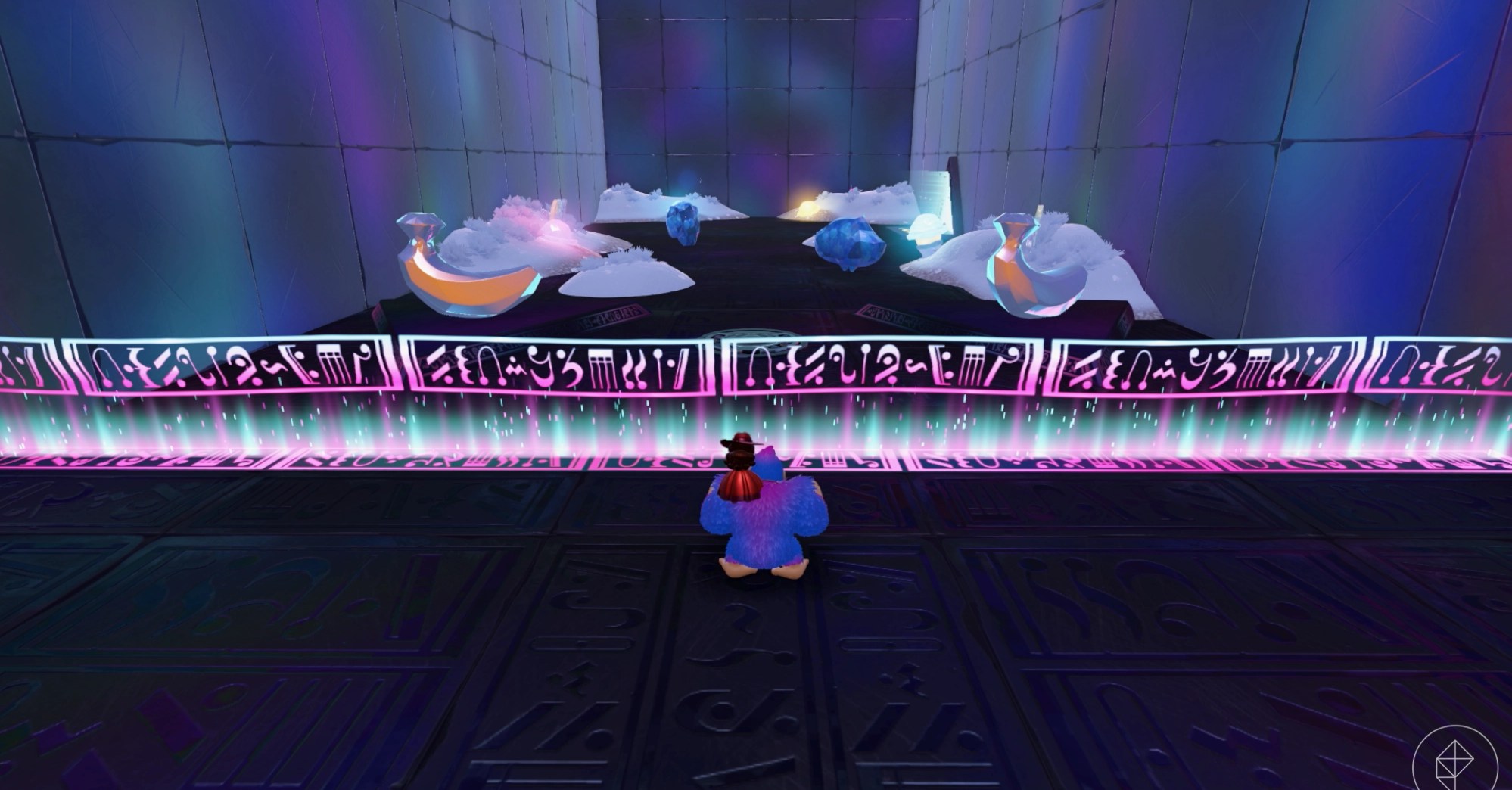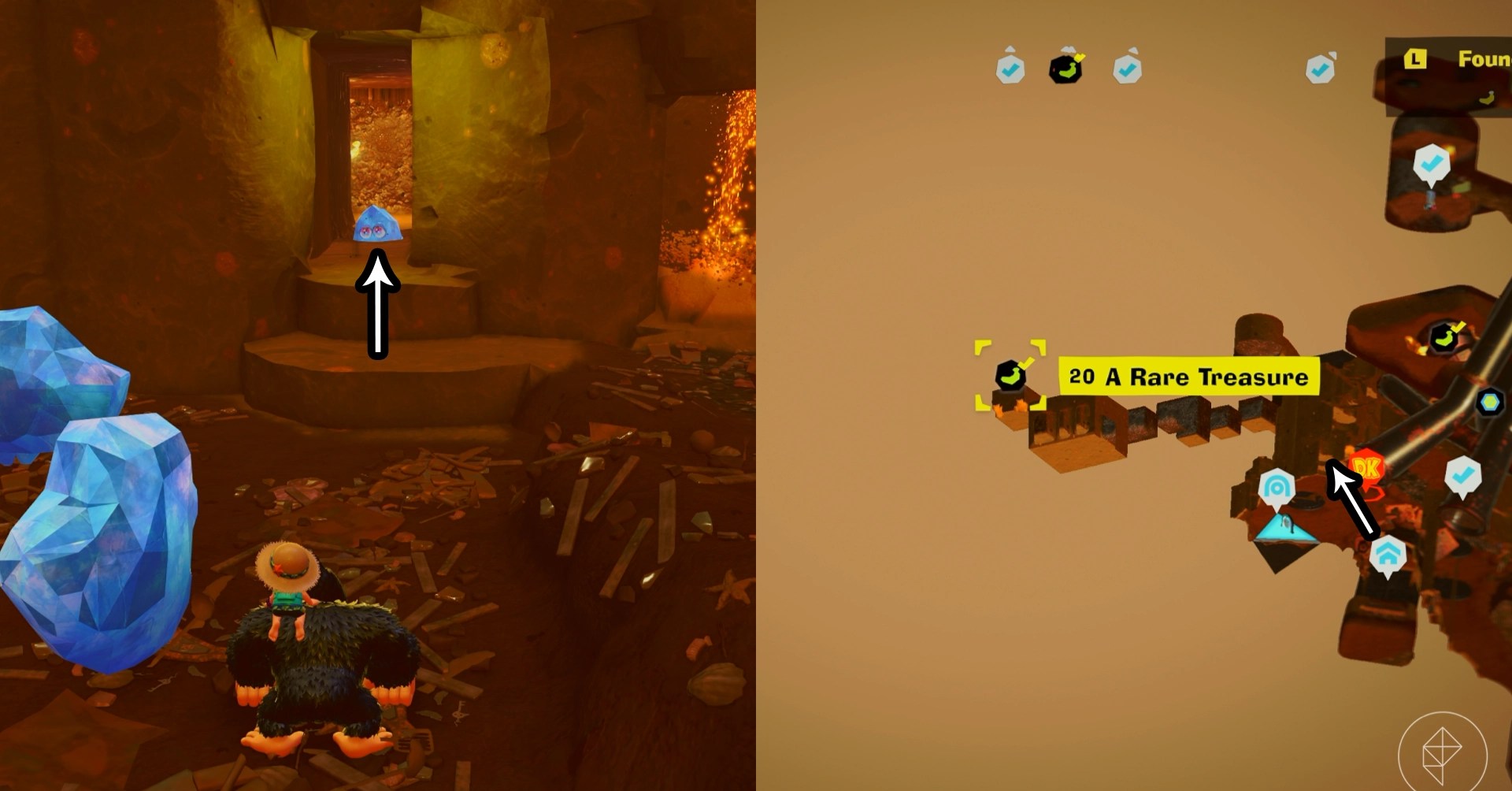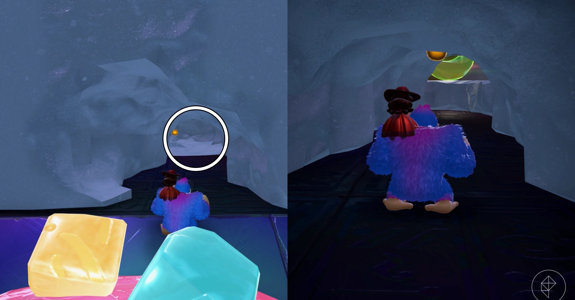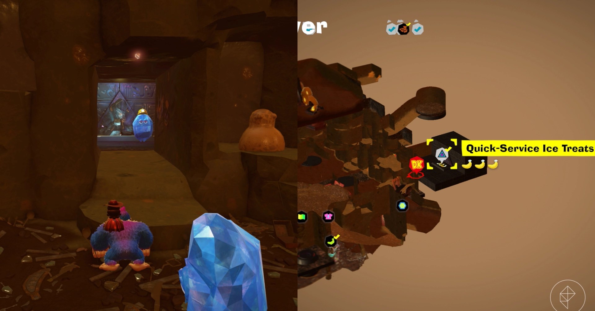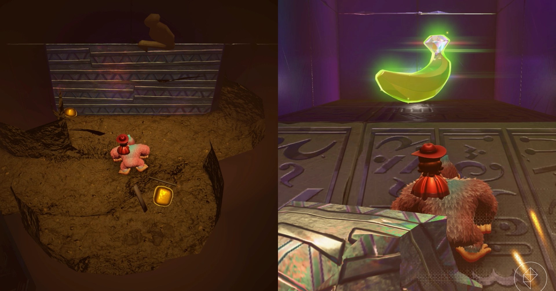 Ao lado do gongo de urdidura, você encontrará uma pequena lasca na parede com um fractone. Siga o fractona através das paredes de terra até chegar a uma sala de tesouro. Quebre a parede segurando o fóssil para encontrar uma banana escondida atrás dela.
