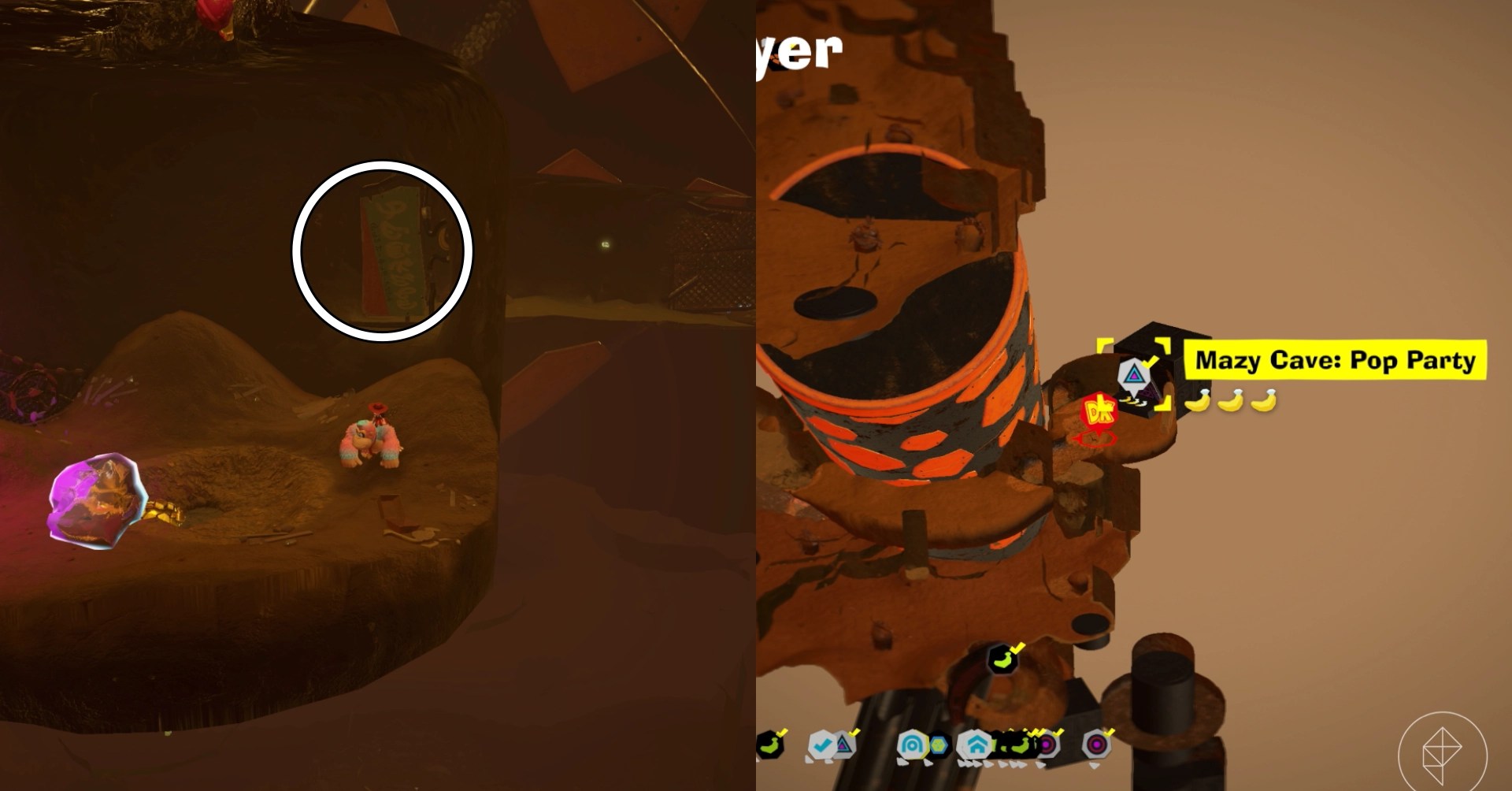 Para encontrar o curso Mazy Cave: Pop Party Challenge, você deve começar no Upper Pit Titing Fork e depois cavar, como fez pela história. Depois de cavar o cristal e o ouro, terminando na pequena sala, você deve seguir a caverna marcada acima, perfurando todos os becos sem saída para encontrar esse quebra -cabeça do labirinto.