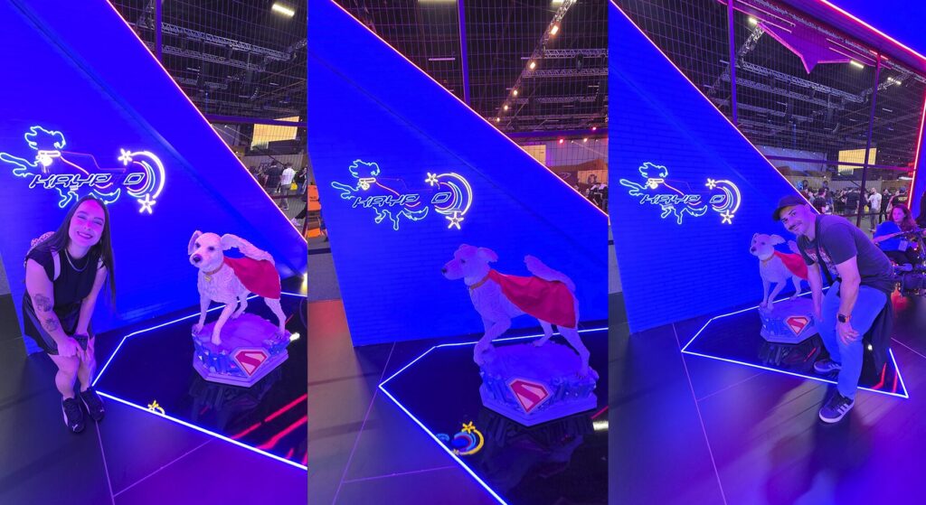 O espaço da DC tem alguma ativações legais, mas o que salta aos olhos é o uniforme utilizado pela SuperGirl no filme e a escultura de Kripto, seu supercãozinho que roubou a cena no último filme de Superman.