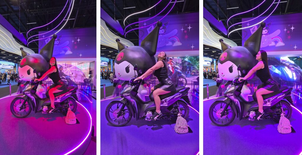 A fabricante Honda está presente no evento com uma novidade inusitada: Uma moto com temática da personagem Kuromi. Sensualizar está permitido.