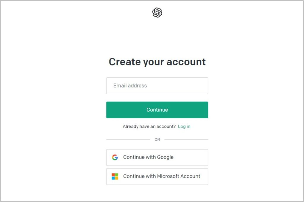 4. Na próxima página, você pode usar seu endereço de e-mail para criar uma conta. Como alternativa, você também pode usar contas do Google ou da Microsoft para se inscrever no OpenAI.