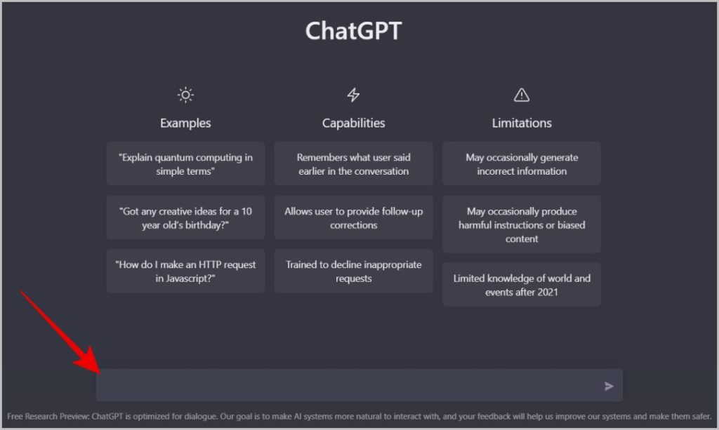 1. Depois de fazer login, você pode abrir o link ChatGPT para acessar a página de bate-papo. Na página, você deve encontrar uma caixa de mensagem na parte inferior, como qualquer serviço de bate-papo.