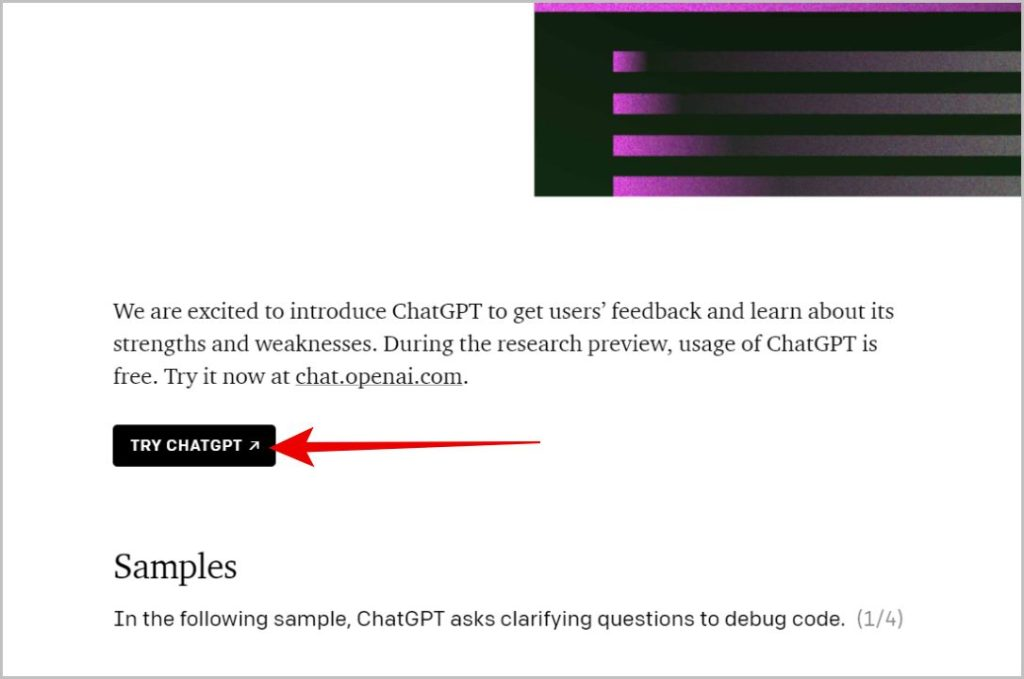 1. Primeiro, clique neste link para abrir a página ChatGPT no site da OpenAI. Em seguida, role para baixo e clique no botão Try ChatGPT.