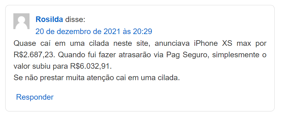 No site éconfiavel.com, a ficha da empresa é repassada batendo com as informações que constam no próprio site. No campo de reclamações, um internauta relata que ao tentar comprar um produto no site, a compra pulou para um valor muito maior na tela de conclusão do pedido.