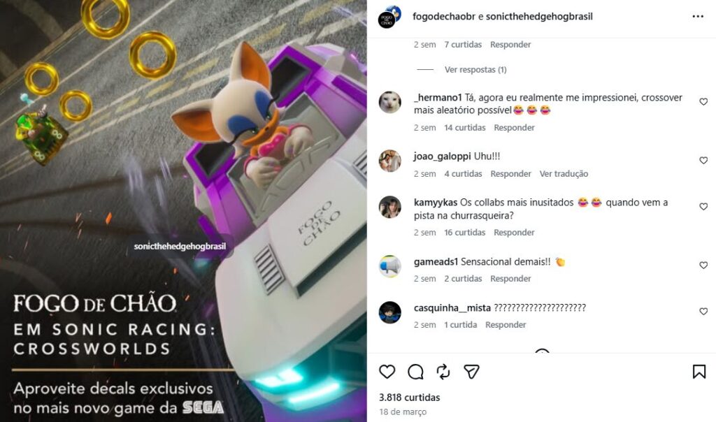 Na conta oficial da churrascaria no Instagram, a novidade foi compartilhada em collab junto com a conta oficial de Sonic no Brasil, e o conteúdo surpreendeu alguns internautas, que acharam a ação inusitada, mas ficaram curiosos sobre a parceria, algo que rendeu alguns comentários hilários, como a sugestão de uma pista numa churrasqueira.