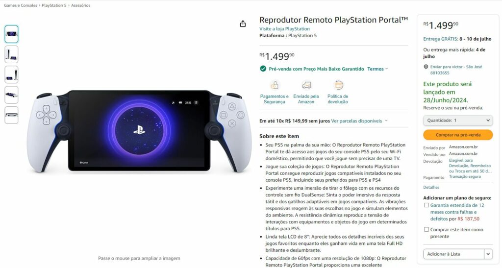 É importante ressaltar: o PlayStation Portal requer obrigatoriamente um PlayStation 5. Ele não funcionará sem um PS5. Fique atento a isso. Segundo a própria loja da Playstation no site oficial da Amazon, o Plyastation Portal está saindo a R$1.499,90, podendo ser dividido em até 10x sem juros no cartão, mas atente-se os detalhes antes de efetuar a compra, pois ela funciona assim: