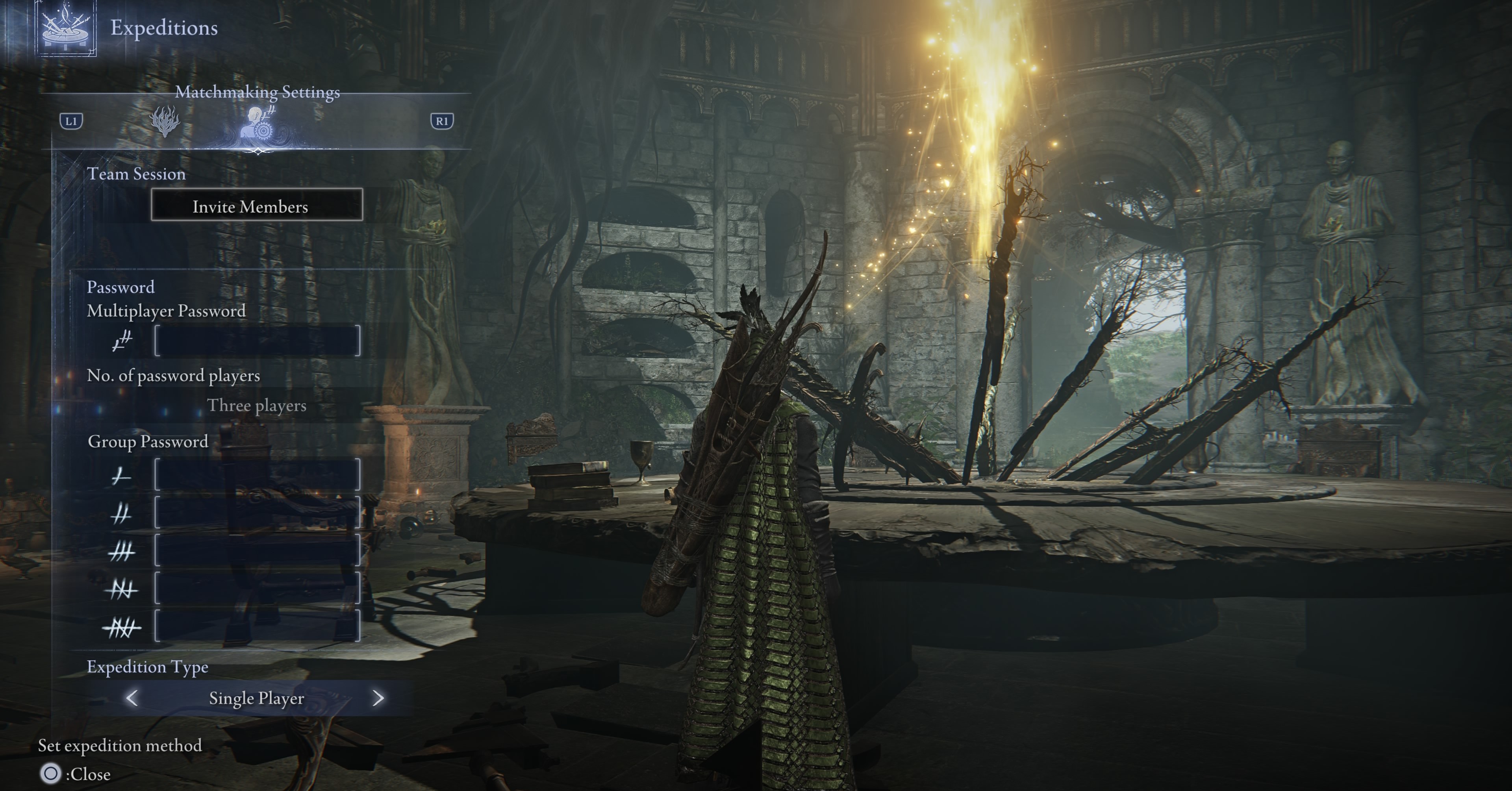 Para iniciar uma expedição solo (o multiplayer é o padrão do jogo), basta caminhar até a mesa de retenção da mesa redonda e pressionar o botão de interação/ação de evento (△ no playstation, ⓨ no xbox). Na tela Expedição, volte para a tela Configurações de correspondência, role para baixo até o tipo de expedição e selecione um único jogador.