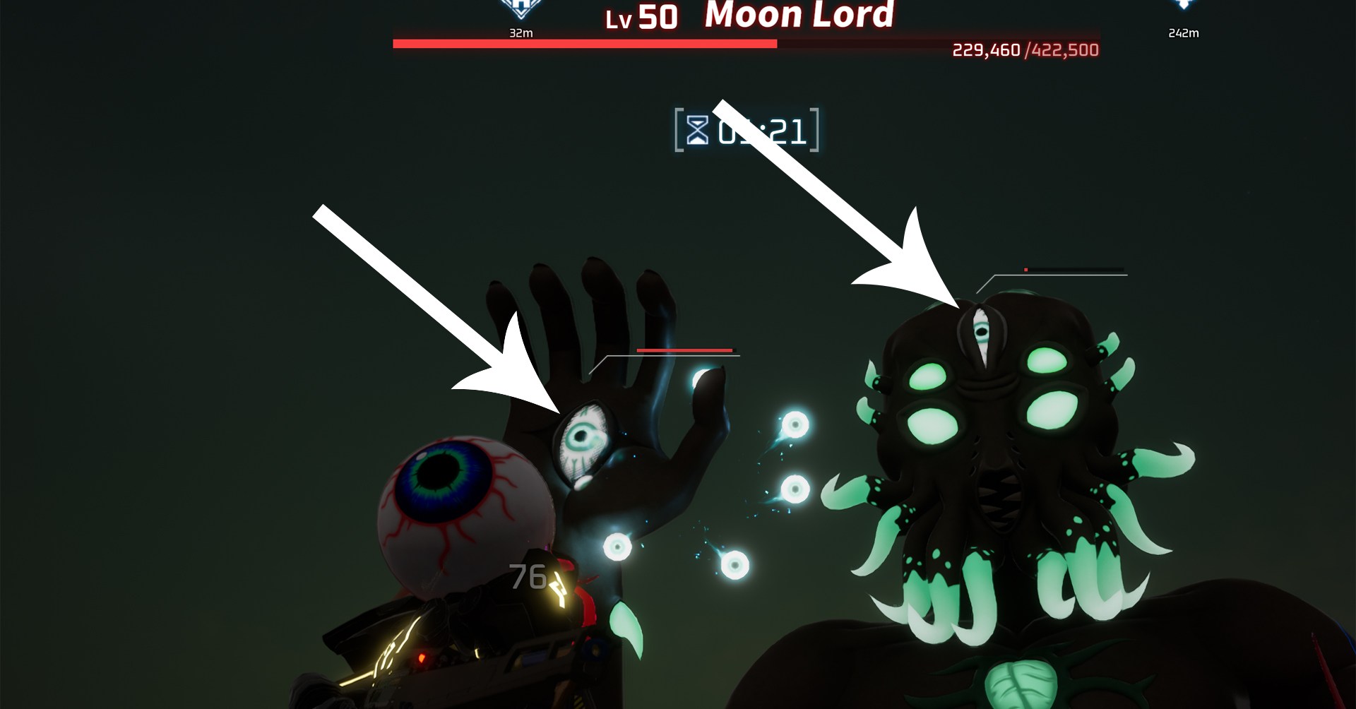 Cuidado com o globos oculares flutuantes convocado pelo Senhor da Lua ao longo desta luta; Depois de pairar no ar por um tempo, eles disparam diretamente em sua direção. Da mesma forma, o Senhor da Lua atira em um feixe a laser Da testa dele que o segue pelo campo de batalha, então continue se movendo!