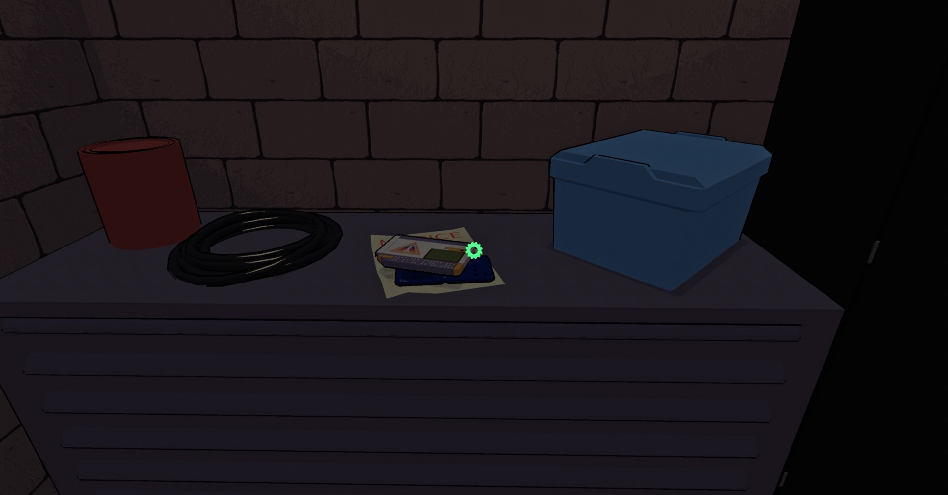 Como é difícil navegar nesta sala em escuridão quase completa, não ande mais do que o necessário; Pegue o Blue Keycard Da mesa logo atrás da porta, o que é tudo o que você precisa por enquanto. Está em um sinal de “aviso” junto com um cartão de acesso (você precisará disso para acessar um computador posteriormente). Se você ficar preso na escuridão, é útil aumentar o brilho do jogo nas configurações.