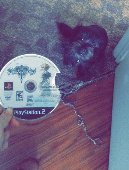 Imagina que você tem uma coleção de jogos de PS2, guardados devidamente em suas capinhas, e eis que um dia você esquece de guardar um deles. Na maioria dos casos, a gente acaba esquecendo forever por aí, e adivinha quem encontra? Isso mesmo, a imagem já diz tudo. Foi uma ajuda e tanto do cachorrinho, que zerou o jogo, literalmente.