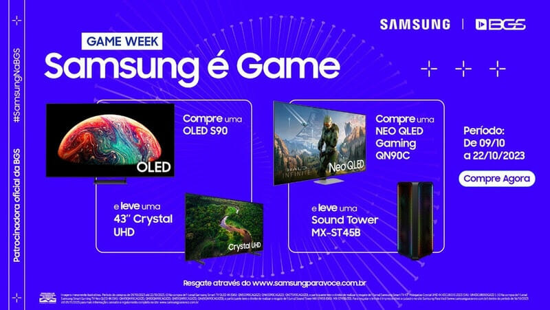 Mesmo quem não comparecer ao evento, este ano, poderá aproveitar as promoções especiais da Samsung Game Week. De 9 a 22 de outubro de 2023, os gamers poderão fazer o upgrade no setup ao comprar uma nova Smart TV participante, com modelos variados que oferecem presentes sem custo adicional1. Ao adquirir uma Neo QLED Gaming TV QN90C durante o período promocional, o jogador ganha a nova Sound Tower Samsung, para deixar as festas em casa muito mais animadas. Já quem comprar a nova TV Samsung OLED durante a promoção, leva na faixa uma Smart TV Crystal UHD 43’’ para curtir seus conteúdos favoritos com a qualidade que só a Samsung tem.