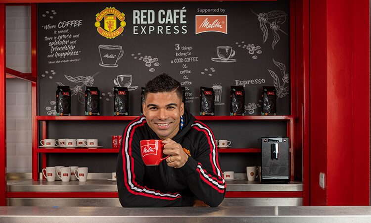 O jogador brasileiro Casemiro posa para publicidade da Mellita dentro do espaço de café, localizado no estádio dos Reds. (Imagem: Divulgação)