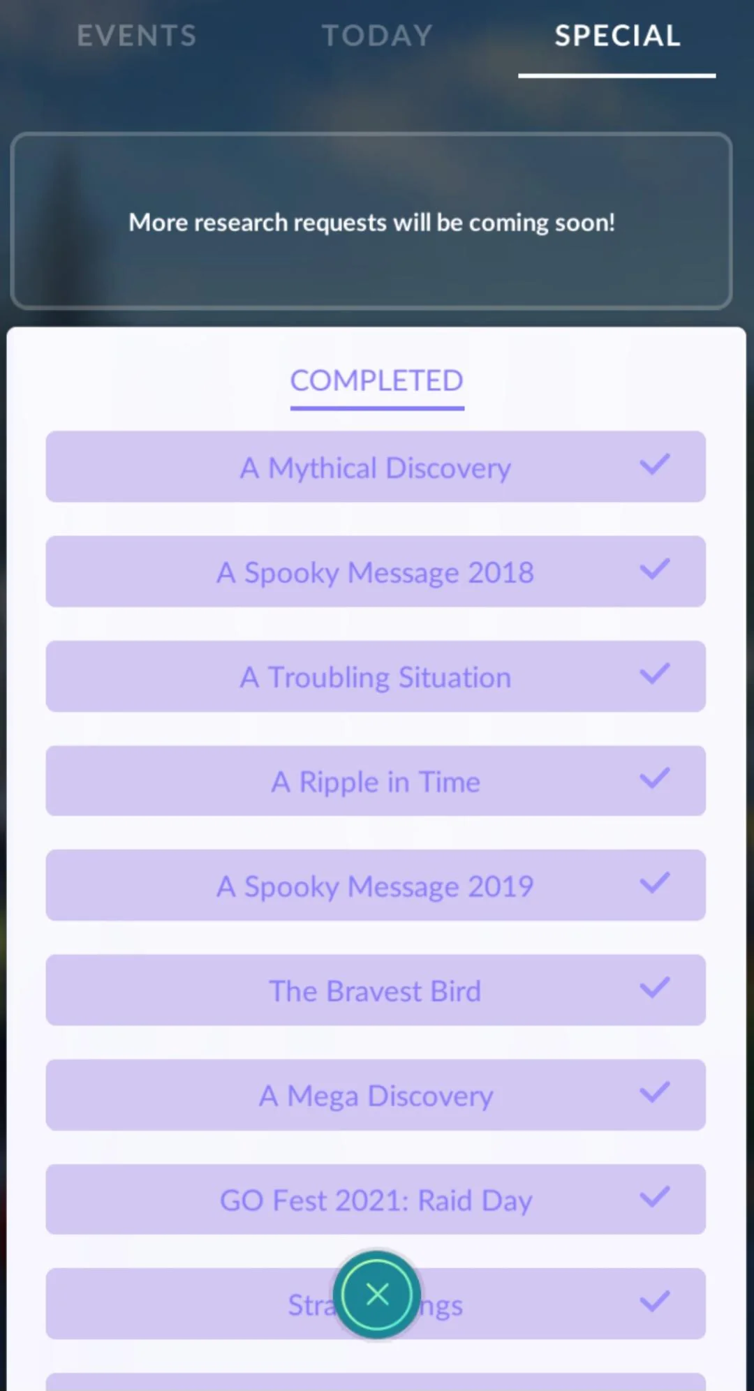 Os Estudos Especiais são histórias paralelas que envolvem os jogadores em diversas missões, oferecendo recompensas únicas e a chance de encontrar Pokémon especiais. Em quase todas as atualizações do aplicativo móvel, as equipes da Niantic adicionam novos estudos para coincidir com a temporada atual, permitindo que os jogadores obtenham recompensas relacionadas.