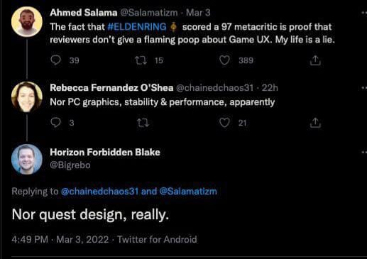 Alguns desenvolvedores de jogos resolveram criticar o jogo Elden Ring, no Twitter, pelo fato do mesmo estar sendo elogiado pela imprensa. O diretor de UX da Ubisoft Stockholm, Ahmed Salama, chegou a dizer que sua ‘vida é uma mentira’.