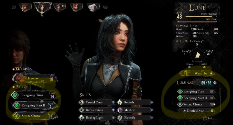 Pictos e Lumina são a opinião de Clair Obscur sobre equipamentos opcionais que fazem coisas interessantes e úteis. Cada caractere tem três slots para pictos, que aumentam estatísticas como saúde ou poder, e também oferecem bônus específicos, como um ponto de ação extra durante o combate, por exemplo.