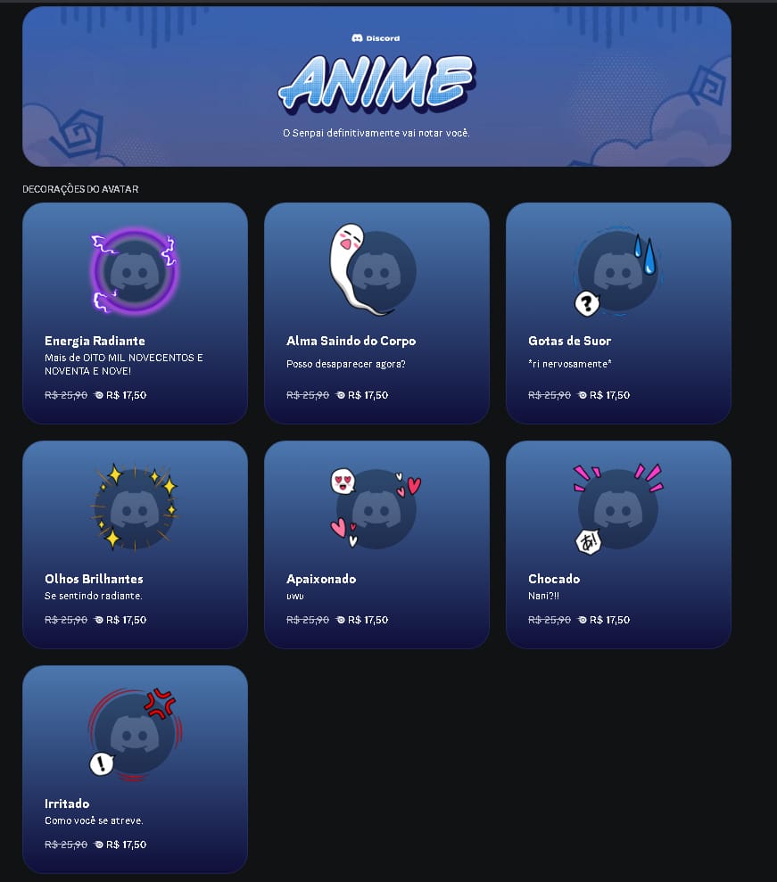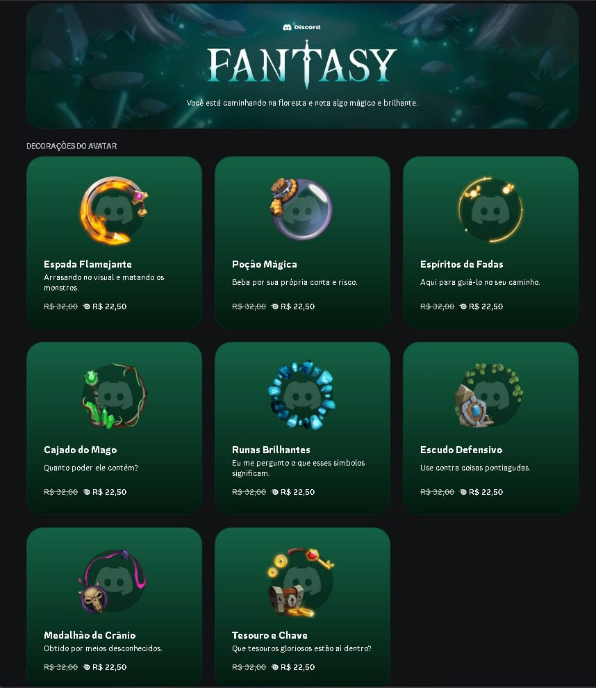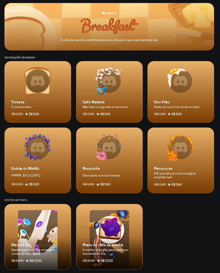 Dentre as opções de temas decorativos, nós temos 3, que são o “Fantasy”, “Anime” e “Breakfast”, os três possuem molduras de avatar com vários estilos diferentes, e efeitos de perfil. Para os usuários padrão será cobrado o preço cheio, enquanto aqueles que utilizam o Nitro conseguirão um desconto. Confira abaixo as fotos de cada estilo.