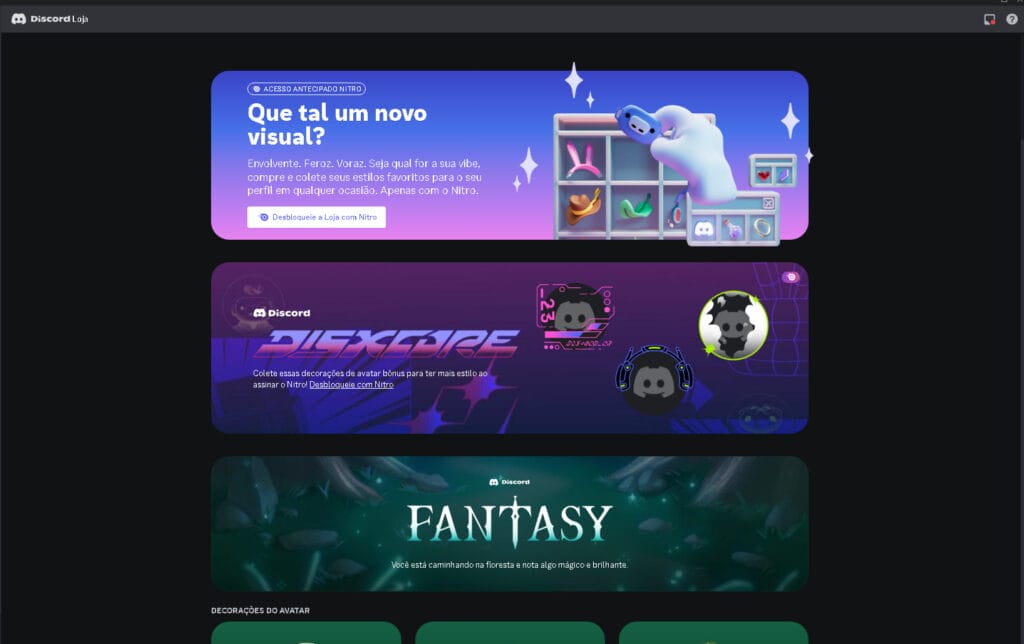 Após clicar em loja, uma janela irá aparecer mostrando vários benefícios, para os não assinantes do Nitro uma opção perguntando se o usuário quer fazer a assinatura desse modo irá aparecer no topo para desbloquear alguns produtos, porém indo mais para baixo é possível encontrar itens que ambos podem utilizar.