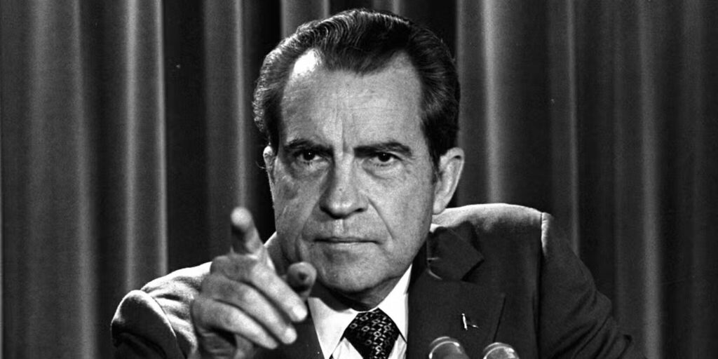 Richard Nixon foi o infame trigésimo sétimo presidente dos Estados Unidos, tendo servido anteriormente como vice-presidente de 1953 a 1961 sob Dwight D. Eisenhower. As ações mais positivas de Richard Nixon, incluindo o estabelecimento da Amtrak e da Agência de Proteção Ambiental, foram ofuscadas pelo escândalo Watergate que resultou em sua renúncia quando detalhes sobre seu envolvimento foram expostos aos Estados Unidos da América e ao mundo.