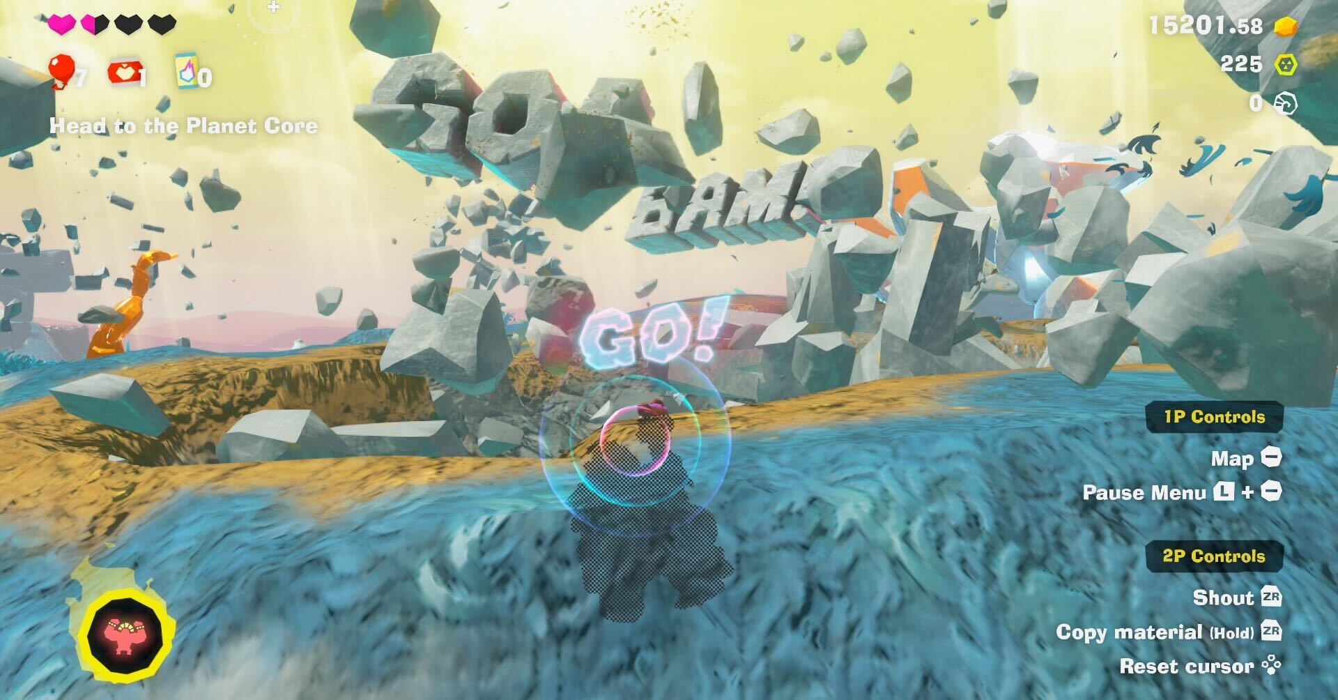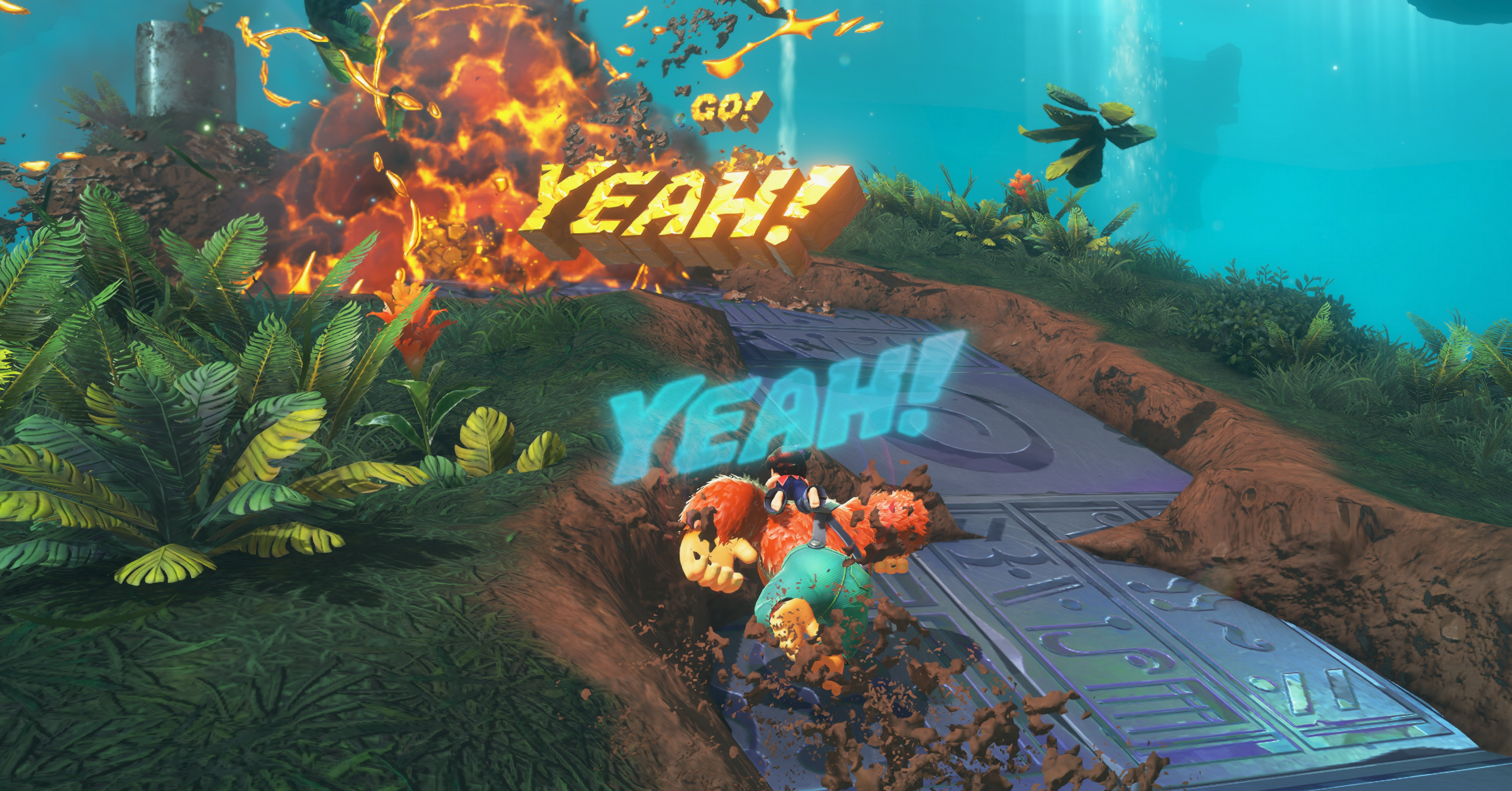 Mas porque isso é Donkey Kong Bananzaum jogo sobre a alegria da destruição, não foi suficiente simplesmente dar ao jogador dois um atirador de ervilha. Então, em vez disso, eles recebem uma bazuca. Toda vez que o jogador dois dispara uma pedra, ou qualquer outro material que possa copiar mantendo o gatilho do Joy-Con, eles disparam uma enorme explosão que é aparentemente 10x mais forte que o soco de DK. Cada tiro é acompanhado por uma palavra gigante como “Sim!” Isso aparece na tela. Não há quantidade definida de munição nem recarga entre os tiros.