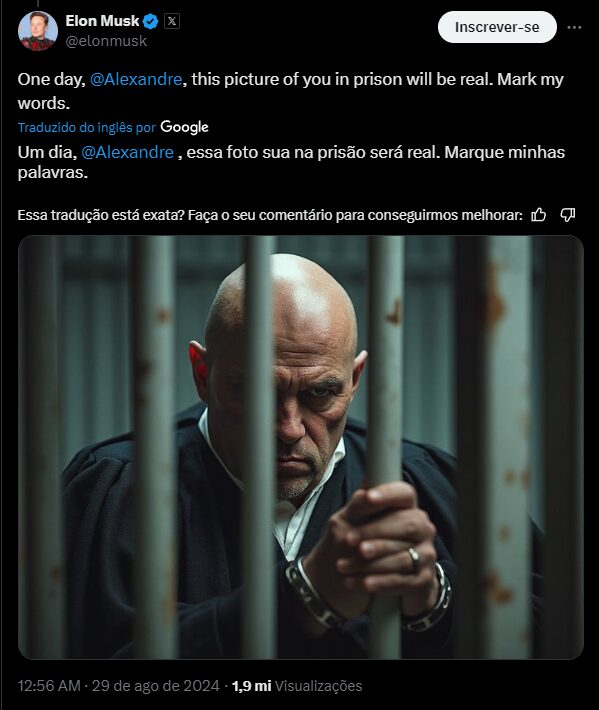Em resposta a esta intimação, Elon Musk diz que “Um dia, Alexandre, essa foto sua na prisão será real. Marque minhas palavras”. Confira a resposta abaixo ou clicando aqui.