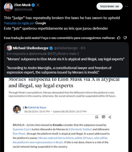 Por fim, em uma postagem que fez, ressaltando uma matéria traduzida do jornal Estadão, Musk diz que “o juiz quebrou repetidamente as leis que jurou defender”. Veja a publicação completa clicando aqui. Nos últimos meses, Moraes e Musk travavam esta batalha judicial, e por mais que não saibamos qual será o final dela, podemos ter certeza que esta história ainda está longe de terminar.