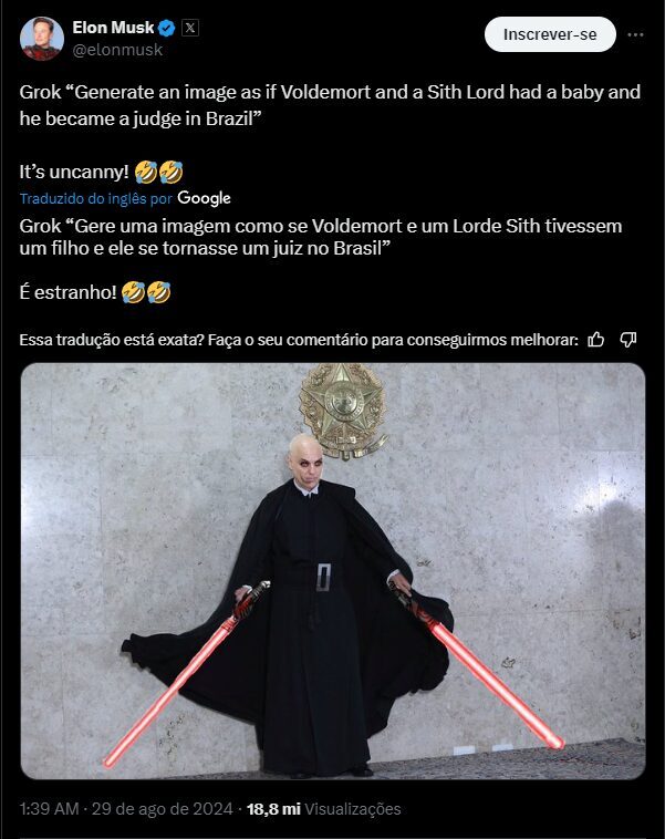 Além das respostas, Musk ainda criou memes para provocar o ministro do STF, onde faz analogias com o papel higiênico, Harry Potter e Star Wars. Você pode conferir as respostas abaixo ou clicando aqui e aqui.