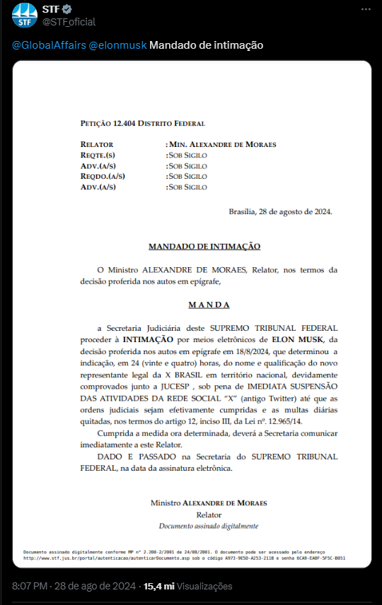 Ontem, dia 28 de agosto as 20h07 da noite, um mandado de intimação feito publicamente dentro da plataforma, tendo como intimado o próprio Elon Musk. Muitos internautas não entenderam como uma intimação feita através de uma rede social poderia ser considerada “legal”, e muitos usuários comentaram sobre a publicação. Veja a postagem a baixo clicando aqui.