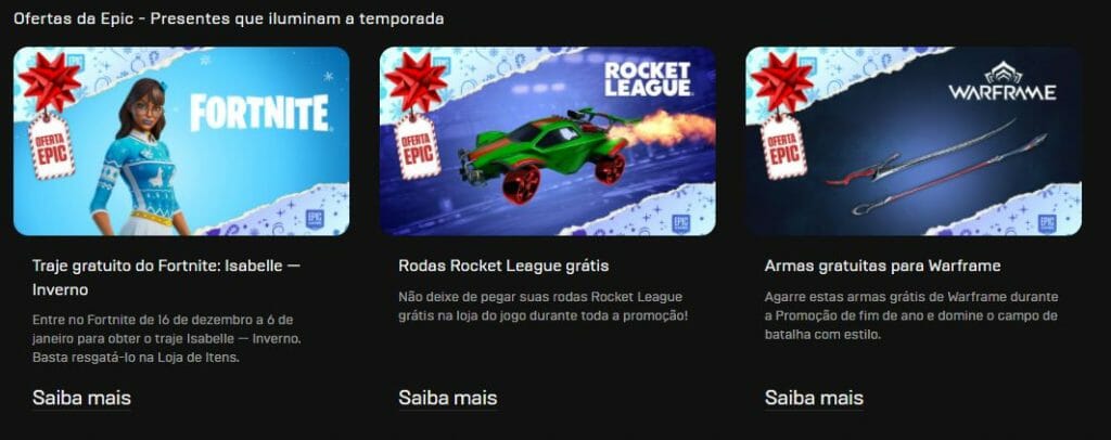 A Promoção de Fim de Ano da Epic Games Store vai de 16 de dezembro de 2021 às 13h BRT até 6 de janeiro de 2022 às 13h BRT. Os cupons expiram na quinta-feira, 6 de janeiro de 2022, às 13h (horário de Brasília).