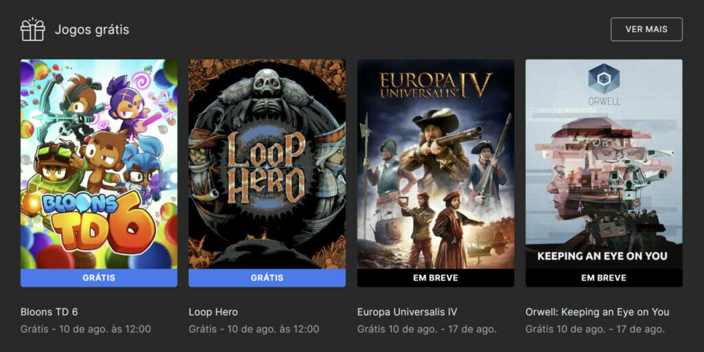 E como acontece todas as quintas-feiras, hoje (3), a Epic Games liberou dois jogos totalmente gratuitos para os jogadores de PC, sendo eles: Bloons TD 6 e Loop Hero. Eles estarão disponíveis para serem reivindicados até o dia 10 de agosto, quando serão trocados por Europa Universalis IV e Orwell: Keeping an Eye on You. Confira a descrição e o link para os novos jogos de hoje.