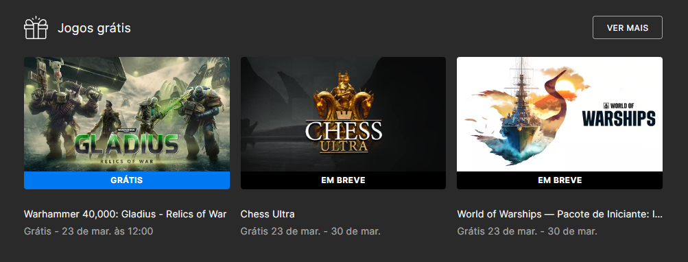 O mais novo jogo gratuito para os usuários da Epic Games Store já está disponível para ser revindicado. O título é Warhammer 40,000: Gladius – Relics of War, que ficará disponível até o dia 23 de março, quando será substituído pelos dois novos Chess Ultra e World of Warships — Pacote de Iniciante: Ishizuchi, que ficam até 30 de março.