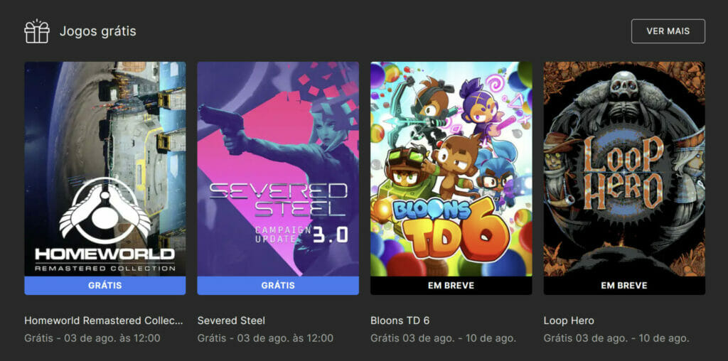 Hoje (27), a Epic liberou dois super jogos de ficção cientifica para seus usuários: Homeworld Remastered Collection e Severed Steel. Os dois títulos estarão disponíveis para os usuários baixarem sem nenhum custo até o dia 03 de agosto. Portanto, aproveite, mas não deixe para a última hora. E como na maioria das vezes, já confirmou os próximos, que serão Bloons TD 6 e Bloons TD 6.