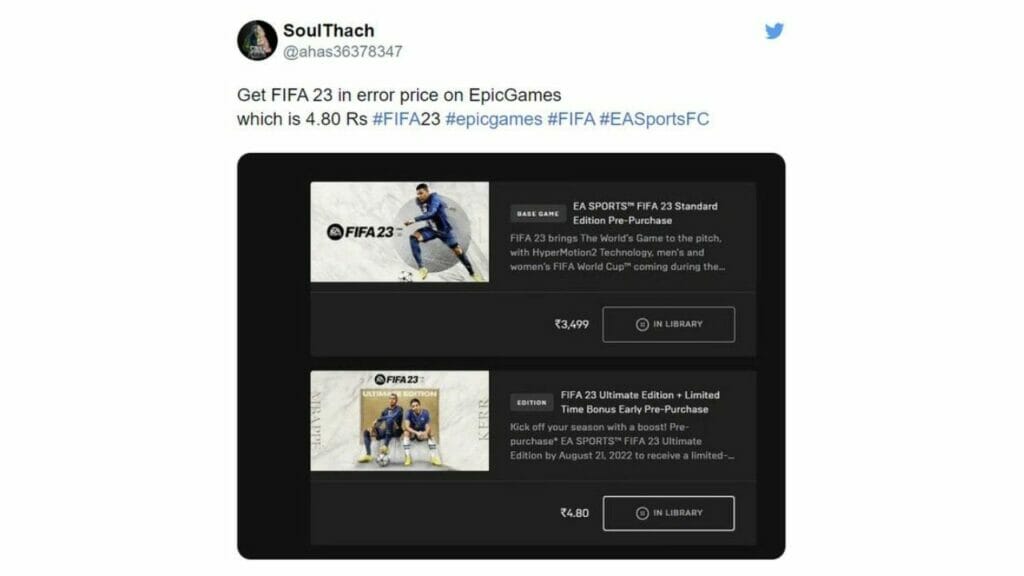 O FIFA 23 está em pré-venda atualmente no mundo todo, devendo ser um lançamento de varejo com preço total. Mas em uma loja específica, os clientes poderiam obter uma pechincha infernal. É que no mês passado, qualquer pessoa que navegasse na Epic Games da índia teria visto que, enquanto a edição padrão do FIFA 23 custava US$ 44, a Ultimate Edition, que deveria custar US$ 60, foi listada em R$0,30.