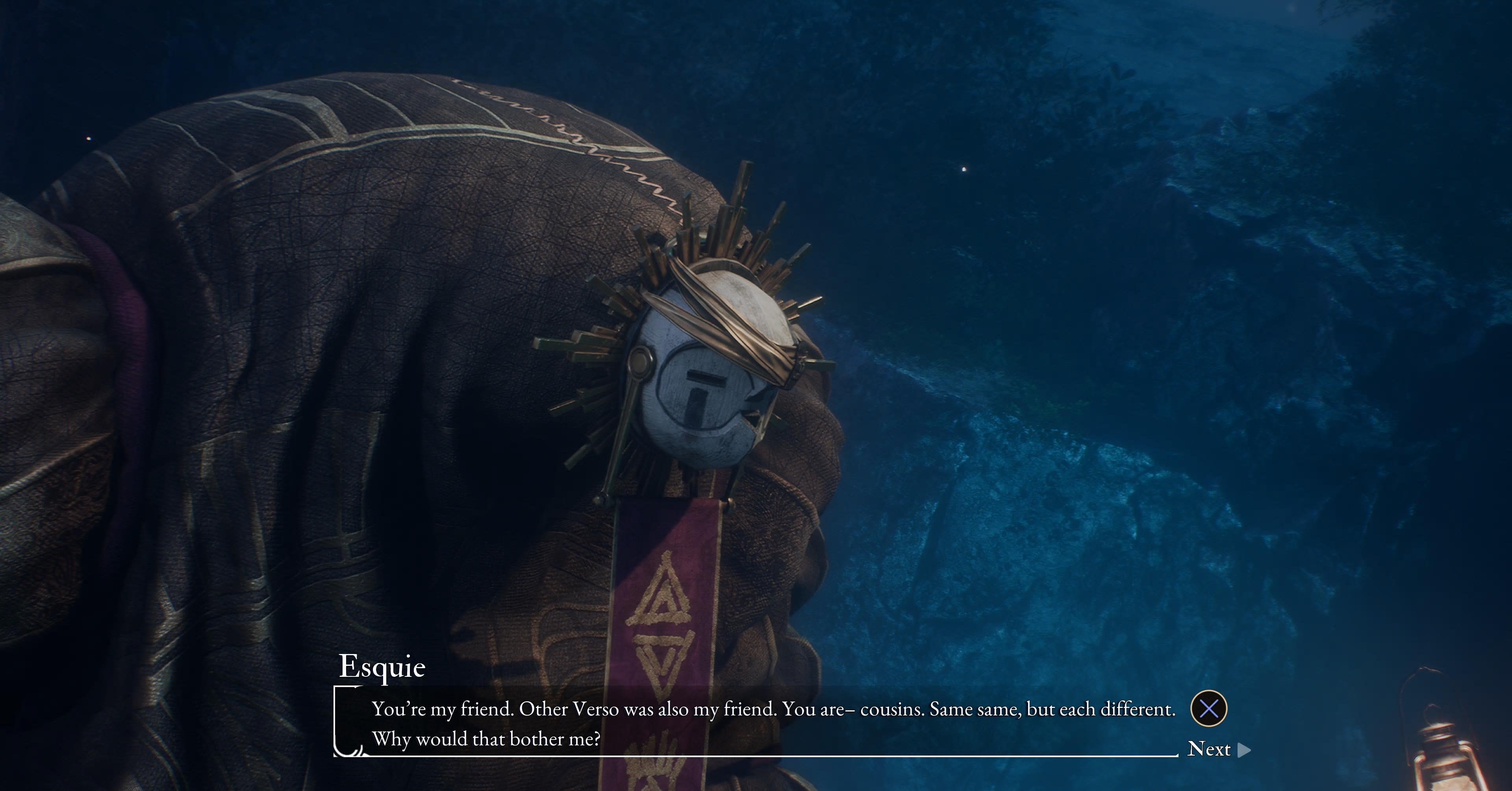 Uma vez que todas as verdades são reveladas até o final de ClaroO segundo ato, e você descobre quem é realmente (pela última vez) – uma cópia pintada do verso real e falecido – verso realmente se abre para Esquie, imaginando se ele perde o verdadeiro verso, se incomoda Esquie que o verso que sabemos que não é o verso que a Esquie é amada. É um momento gritante do jogo; Verso nem sempre foi o mais adiantado sobre suas lutas internas, muitas vezes apenas se abrindo com relutância sobre sua família atingida por sofrimento e seu papel na devastação causada por Lumière.