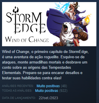 StormeEdge: Wind of Change é um roguelike indie de ação, bem frenético e com aquela gameplay gostosa de jogar. Muito liso, leve, dinânico, mas pouco desafiador. A sua versão demo foi lançada em setembro de 2023 e conta com análises Muito positivas na Steam.