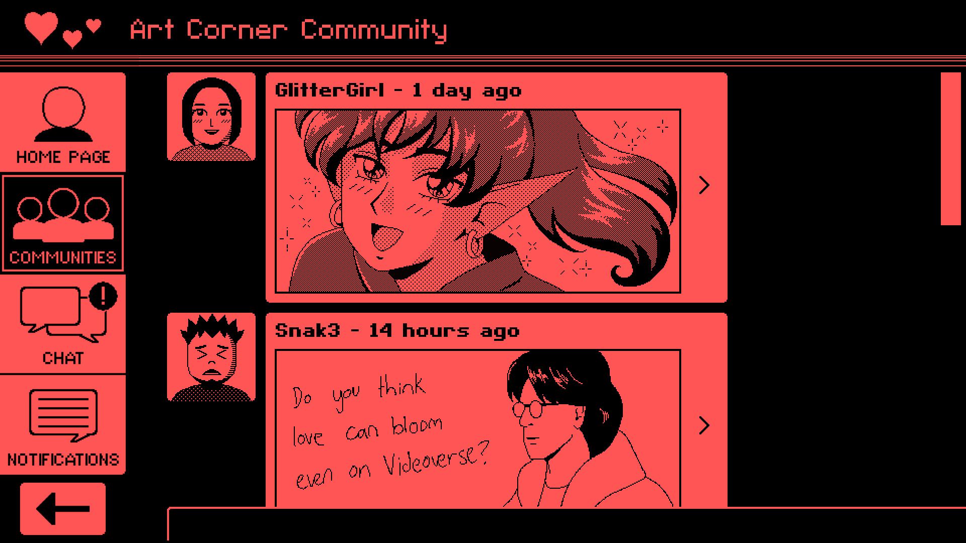 Verso de vídeo deve se sentir em casa no Nintendo Switch. O aplicativo fictício do jogo é inspirado no Miiverse do 3DS e do Wii U, um aplicativo que permitia aos jogadores postar desenhos e interagir uns com os outros. Verso de vídeoA história de cinco horas recria essa experiência, colocando os jogadores dentro de um aplicativo nostálgico onde os personagens postam fan art de jogos como “Feudal Fantasy”. A história se desenrola tanto na seção de comentários dessas postagens quanto por meio de chats de vídeo na câmera do console fictício.