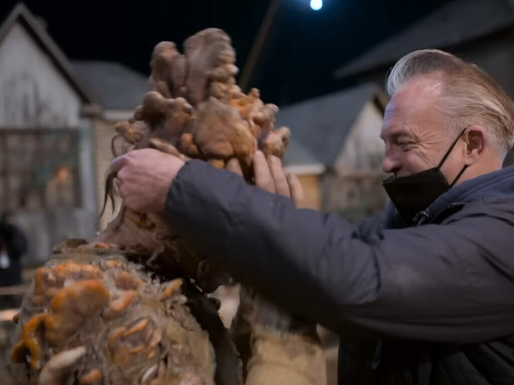“O traje era muito macio, mas muito viscoso e úmido”, disse Gower à Variety . “Nós o cobrimos com essa solução semelhante a um gel, que deu a ele um brilho a todos os fungos. Tínhamos muitos espinhos e pelos espetados perfurados em seu corpo, como pequenos crescimentos saindo de uma toca.